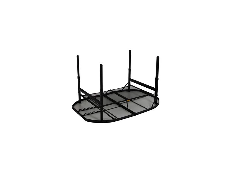 Een stijlvolle ovale aluminium tafel met een industriële uitstraling en betonlook tafelblad. Door middel van stelschroeven zijn de tafelpoten af te stellen op een ongelijke ondergrond. Daarnaast is de tafel zeer compact als koffermodel op te bergen door de afneembare poten en een deelbaar blad. Bovendien is de tafel voorzien van een net onder het MDF tafelblad om spullen in op te bergen, en een handgreep waardoor de tafel gemakkelijk is mee te nemen. De tafel is in hoogte verstelbaar: 36/70 cm.