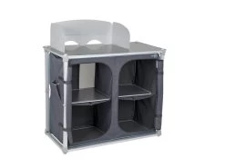 Een compact kookeiland met een unieke constructie. Door zijn unieke constructie is deze kast zeer snel en eenvoudig in- en uit te vouwen. Voorzien van een extra stevige 600 denier polyester hoes met daarin 4 handige legplanken. Het oplegblad van dit kookeiland is hittebestendig, watervast en voorzien van een windscherm (lxb: 61,5×44 cm). Geschikt voor een 4-pits gaskomfoor. De verstelbare poten zijn afzonderlijk af te stellen zodat de legkast op iedere ondergrond stabiel staat. Wordt geleverd in een draagtas. Ingeklapt (lxbxh): 52,5x103x14,5 centimeter.