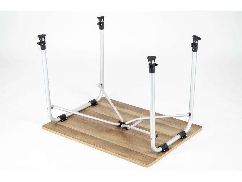 Een lichtgewicht maar zeer stabiele campingtafel. De tafel is heeft een glasfiber top met kunststof rand welke hittebestendig en watervast is. Het frame is van aluminium en de campingtafel is voorzien van voetjes met stabilisatoren zodat de tafel op iedere ondergrond stevig staat. Tevens zijn de poten in hoogte te verstellen (traploos).