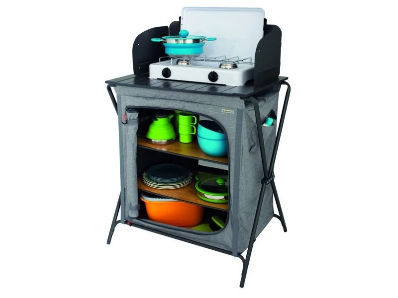 Opvouwbare kooktafel met aluminium top en windscherm. Groot compartiment met 2 etages. De Sava is vervaardigd van het gemêleerd polyester en etage planken zijn van bamboe materiaal en bieden samen met de zwarte topblad en windscherm een luxe uitstraling. Achterzijde van de kast is voorzien van mesh voor ventilatie. Het alu frame is verstelbaar en wordt geleverd incl. windscherm en opbergtas.