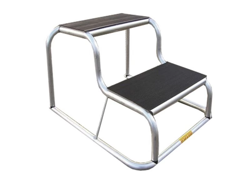 Dubbele opstap van aluminium. De treden zijn ingelegd met rubber wat de algemeene grip ten goede komt.